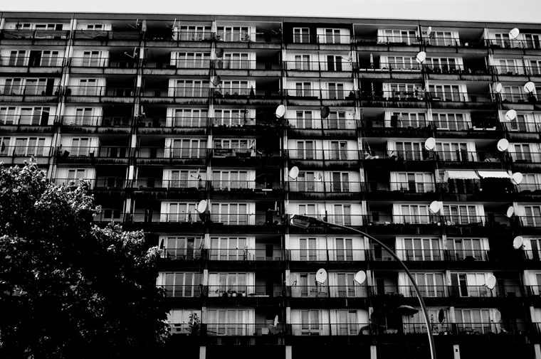 Wieder einmal ein tolles Bild, mit einem vieldeutigen Titel aufgeladen und erregt nun vielfältige Gedanken in mir. Die vielfachheit der Tristesse, die gleichgeformtheit der Satellitenschüsseln, als wollen die Bewohner nach einem besseren Ort, einer besseren Zeit lauschen und schweben nur so in der kontrastreich-harten Gegenwart.