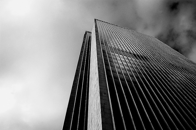 Pure black and white lines of this building reaching the sky and its clouds. And the reflections of some other light in the windows of the right façade. I love everything here, the composition, the proportions, the perspective, the tones.