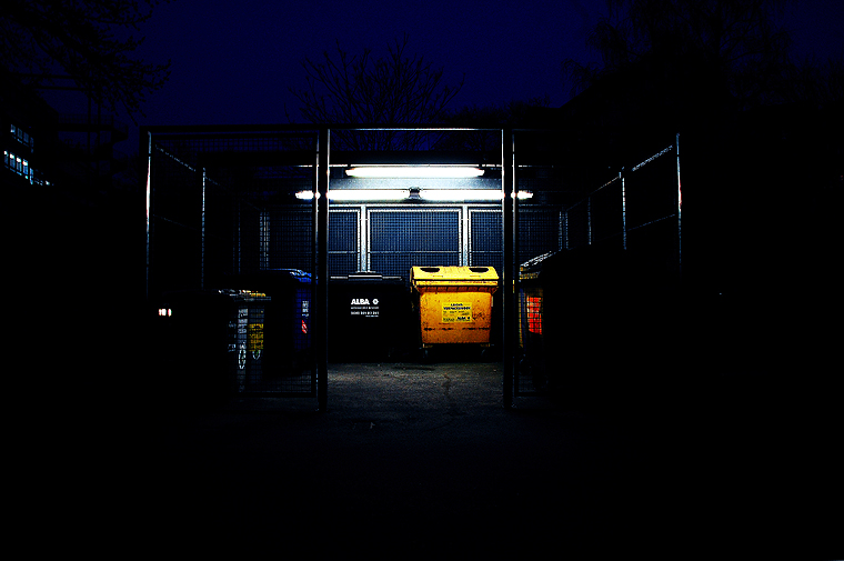 I like the light over the yellow big trash! Every other things are hiding by the darkness… Very clever!