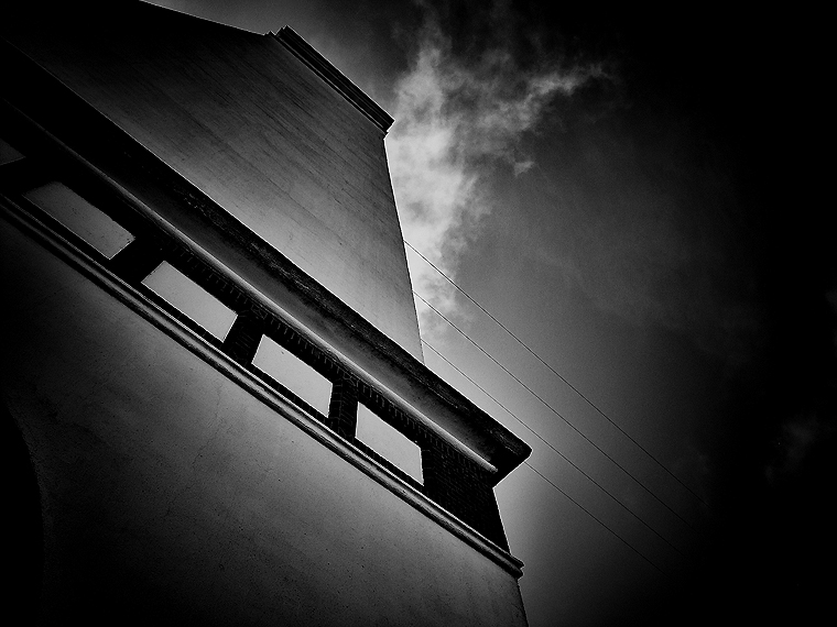 Was für ein mächtiger Pylon. Eine gigantische Wegmarke im Nirgenwo. Oder das Zuhause der Goetheschen Turmgesellschaft. Nein, nur ein opaker Schlot, aus dem dünner Rauch aufsteigt in einen metallisch-grauen Himmel. Oder doch nur ein Leuchtturm am Meer, den letztes Licht trifft, bevor die am Rande sich zeigende Dunkelheit vollständig einfällt. Wie klein man sich fühlt, unter ihm, und aufschauend zu seinen markanten Graten und Ecken wird die Einschüchterung immer größer und größer. Düster, bedrohlich, rätselhaft, wie ein aus fernen Zeiten überkommenes Denkmal erscheint er hier, perfekt in den Rahmen gesetzt, so dass er bei den stürzenden Linien selbst nicht ins Wanken gerät. Er bleibt standfest, ewig, während wir, die ihn bestaunen, schon längst wieder verschwunden sind.