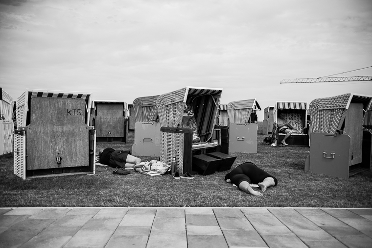 Geschlossene und offene Strandkörbe auf einem Rasenstück, davor ein Plattenweg. Und vom Meer keine Spur. Stattdessen im Hintergrund der Arm eines Krans, der ins Bild ragt. Zwischen den Körben liegen Menschen auf dem Boden. Den Blicken der Vorbeiflanierenden ausgesetzt, scheinen sie doch schlafen zu können und so in aller Öffentlichkeit für eine gewisse Zeit ganz bei sich zu sein. Eine Szenerie, die befremdlich und zugleich verheißungsvoll anmutet.
