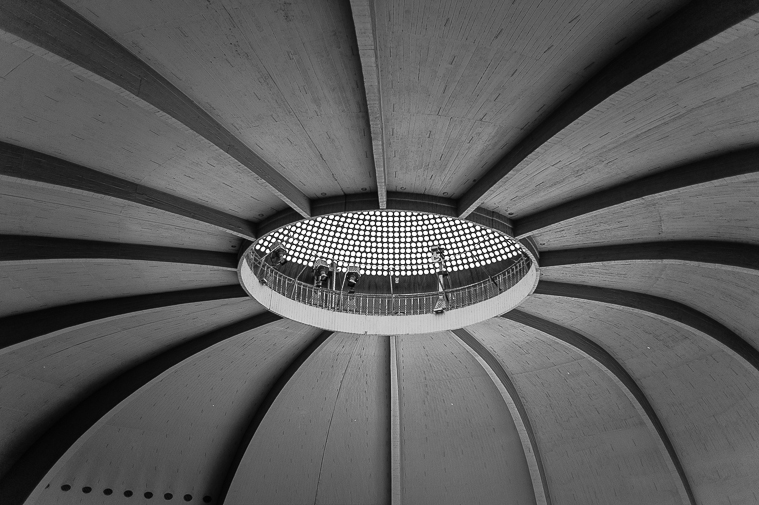 Wie ein spinnenartiges Insekt mit einem riesigen Facettenauge thront dieses architektonische Gebilde über den Köpfen und fesselte den Fotografen und der unseren Blick.