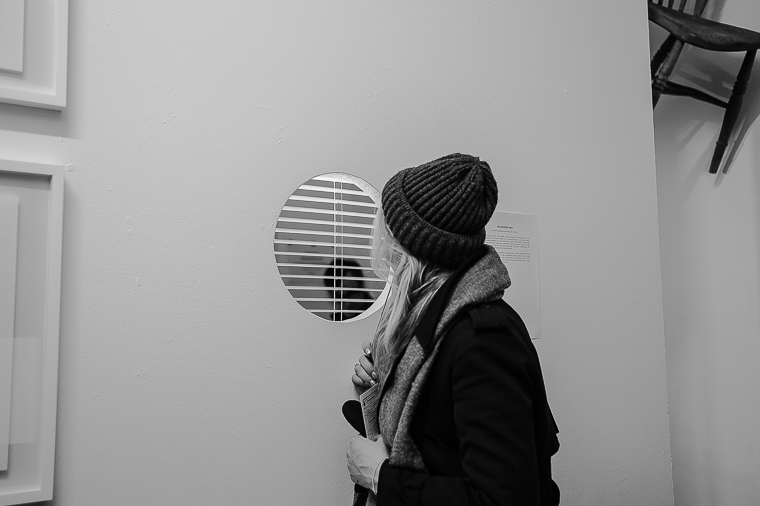 Das Guckloch, die Betrachterin, der hängende Stuhl, das kalte Neonlicht, die weiße Wand, die Exponate, die Leere … Das ist der Mix, aus dem Bilder-Geschichten entstehen, an einem Ort, wo nichts unmöglich scheint, gerade weil der Raum SO begrenzt ist: